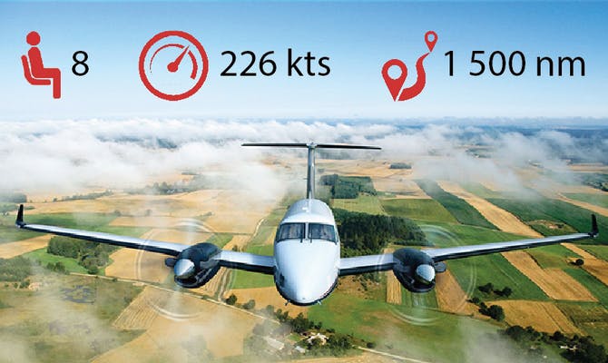 The current flight range of the Beechcraft King Air is 1500 nm, meaning that up to 8 passengers can fly without a fuel stop from the UK to Istanbul or Marrakech, or from Paris to Helsinki.