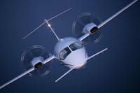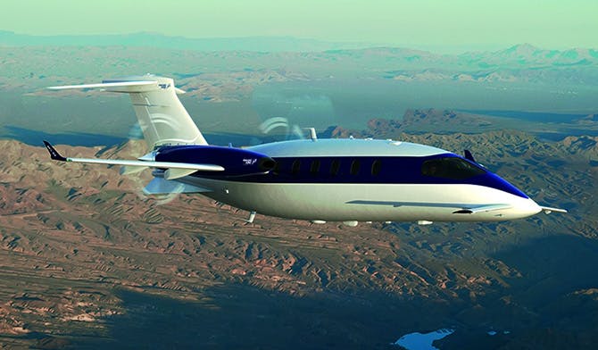 The "push" design of the propeller blades reduces air turbulence interfering with aerodynamics of the wing, making the Avanti more aerodynamic compared to the traditional propeller design used by other propeller aircraft such as the King Air.