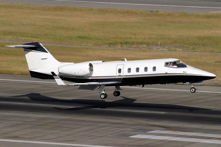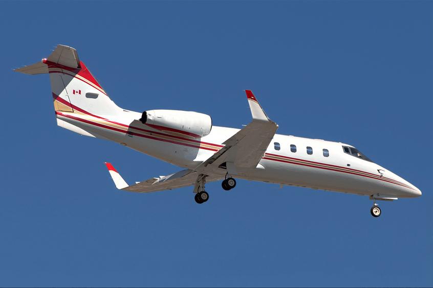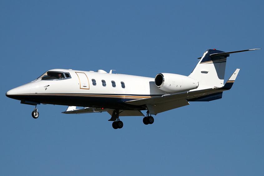 Le Learjet 55 est un jet d'affaires lancé en 1981 et doté d'une cabine haute et large. Facilement identifiable grâce à ses ailes basses et droites terminées par des ailettes et son aileron triangulaire sous la queue, il est doté de huit hublots carrés répartis de part et d'autre du fuselage.